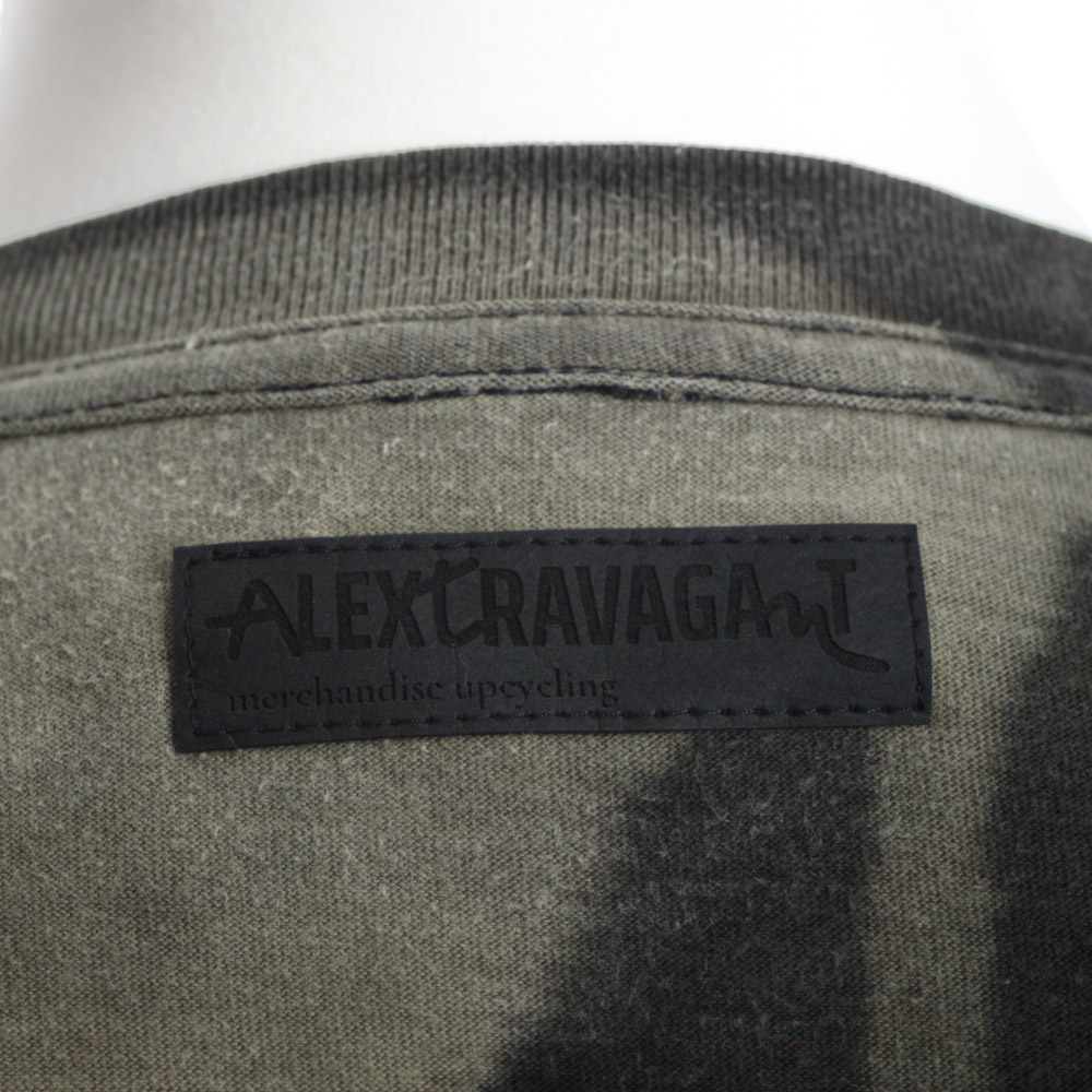 Schwarzes Second-Hand Bandshirt upgecycelt: Auf links gedreht, gebleicht entstand dieser olivgraue Farbverlauf. Auf der linken Brust sitzt eine kleine Maus in neonpink, die sich „Verdammt“ nochmal auf dem großen Rückenprint wiederholt. Das Wort „Verdammt“ im Stil angelehnt an typische Death-Metal Bandlogos. Der Print als Siebdruck stammt von dem Grafiker und Illustrator Simon Schirmer aus Hannover. Sein freier, kursiver Strich und moderner Stil sind seine Markenzeichen. Upcycling made in Hannover, Germany.