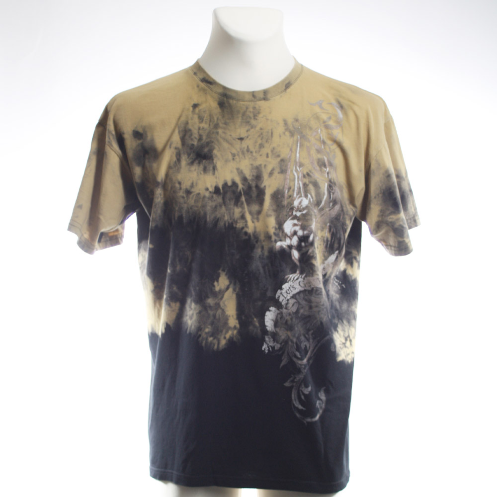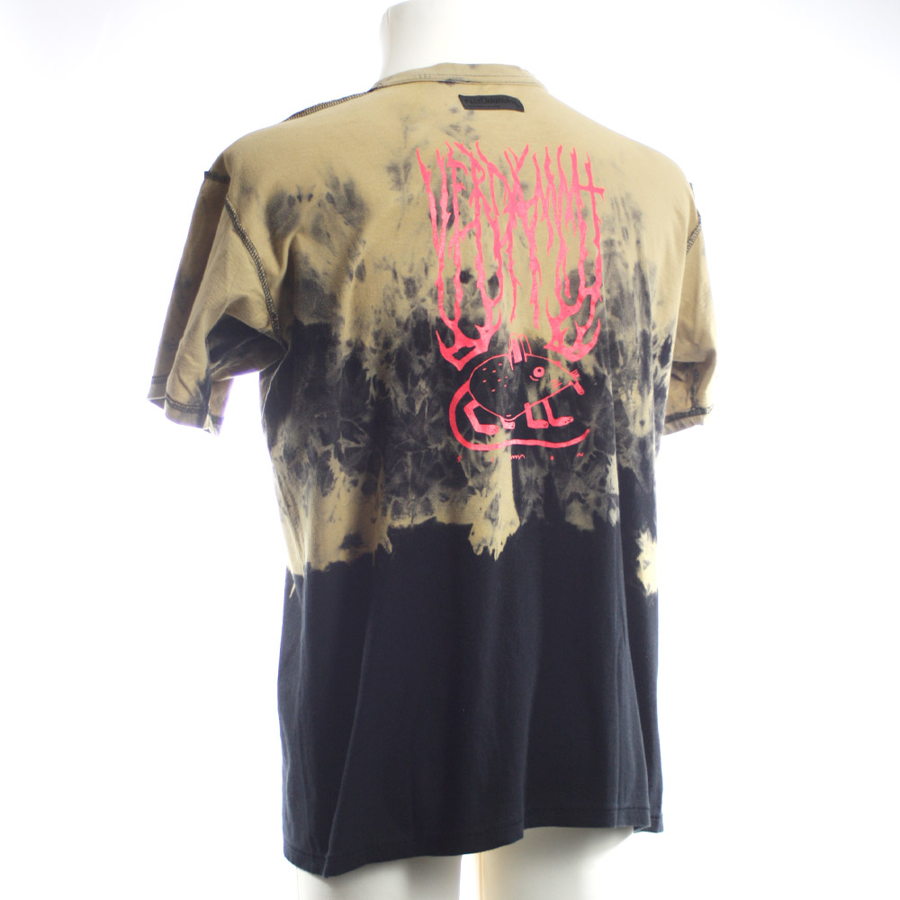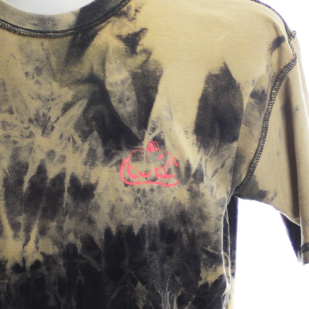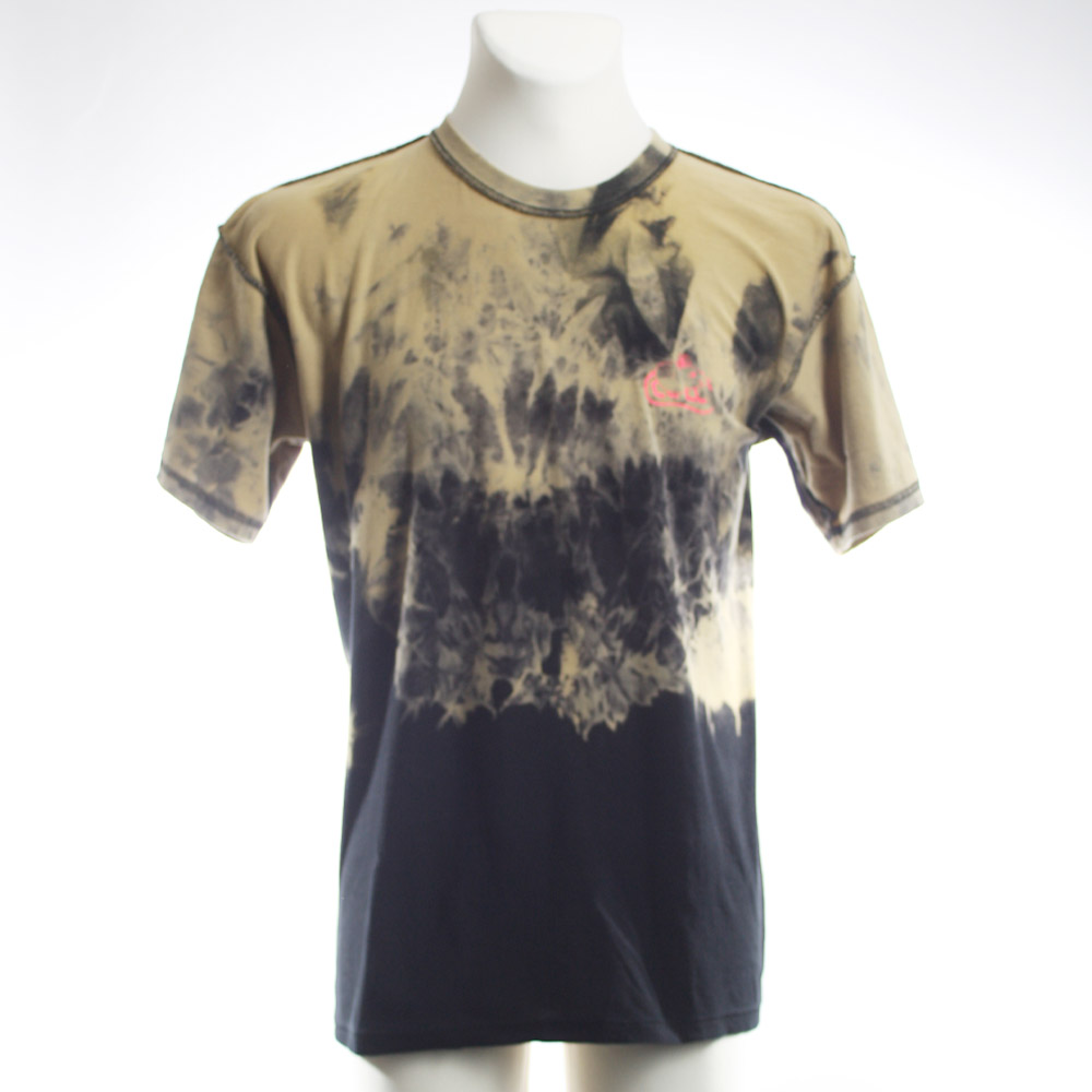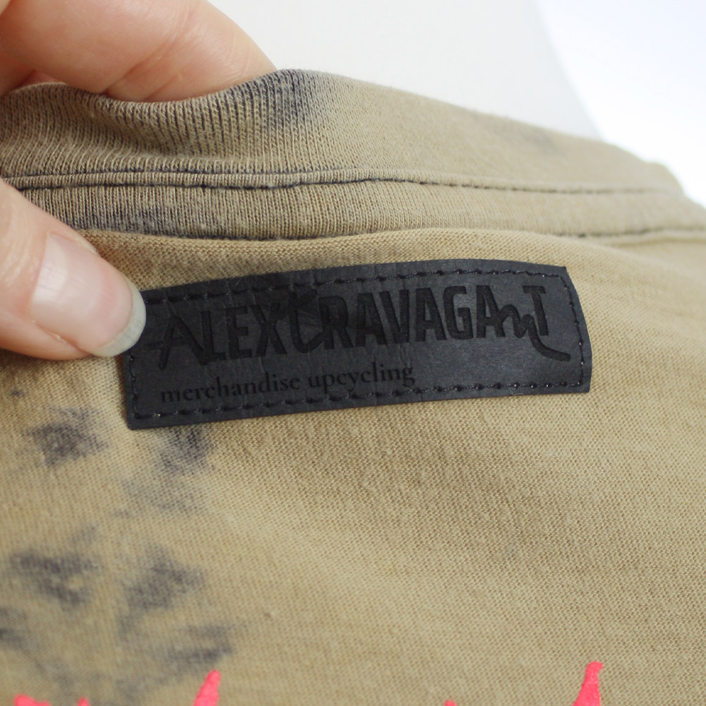 Schwarzes Second-Hand Bandshirt upgecycelt: Auf links gedreht, teilweise enfärbt enstand ein beige-gelben Sandton mit einem faszinierenden Effekt von organischen Strukturen wie unter dem Mikroskop im Übergang zum Original Schwarz des T-Shirts. Auf der linken Brust sitzt eine kleine Maus in neonpink, die sich „Verdammt“ nochmal auf dem großen Rückenprint wiederholt. Das Wort „Verdammt“ im Stil angelehnt an typische Death-Metal Bandlogos. Der Print als Siebdruck stammt von dem Grafiker und Illustrator Simon Schirmer aus Hannover. Sein freier, kursiver Strich und moderner Stil sind seine Markenzeichen. Upcycling made in Hannover, Germany.